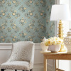 Twining floral vines alternate with hand-picked bouquets for timeless, romantic ambiance in pattern Genevieve. Featured here in a palette of spring and hunter green, golden yellow, beige, taupe, light brown, and white against pale blue. Genevieve is an unpasted, non woven wallpaper measuring 27 inches wide by 27 feet long, covering approximately 60.8 square feet per roll.