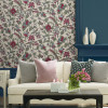 Intricate Jacobean trails sporting voluminous blooms and ripe fruits are visited by exotic birds and butterflies in pattern Parterre. Seen here in a palette of rich raspberry, sky blue, sea green, ochre, pale yellow, and white against palest grey. Parterre is an unpasted, non woven wallpaper measuring 27 inches wide by 27 feet long, covering approximately 60.8 square feet per roll.