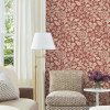 Pattern Rowan encapsulates the beauty of tree's many phases of greenery, flowering, and fruit through artistic silhouettes. The botanical details are inked in cream against a ruby-red backdrop. Rowen is an unpasted, non woven wallpaper measuring 27 inches wide by 27 feet long, covering approximately 60.8 square feet per roll.